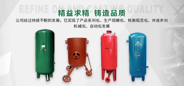 本企業(yè)產(chǎn)品有眾多產(chǎn)品分類,儲氣罐、磨料桶、碳鋼儲氣罐、不銹鋼儲氣罐、中高壓儲氣罐、臥式儲氣罐、緩沖罐、隔膜罐、噴砂罐、分氣缸、以及其他的定做非標產(chǎn)品等,產(chǎn)品廣泛應(yīng)用于化工、制藥、橡膠、石油、食品、機械等行業(yè)。